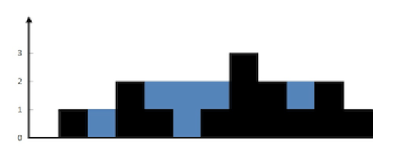解释:上面是由数组 [0,1,0,2,1,0,1,3,2,1,2,1] 表示的高度图,在这种情况下,可以接 6 个单位的雨水(蓝色部分表示雨水)。