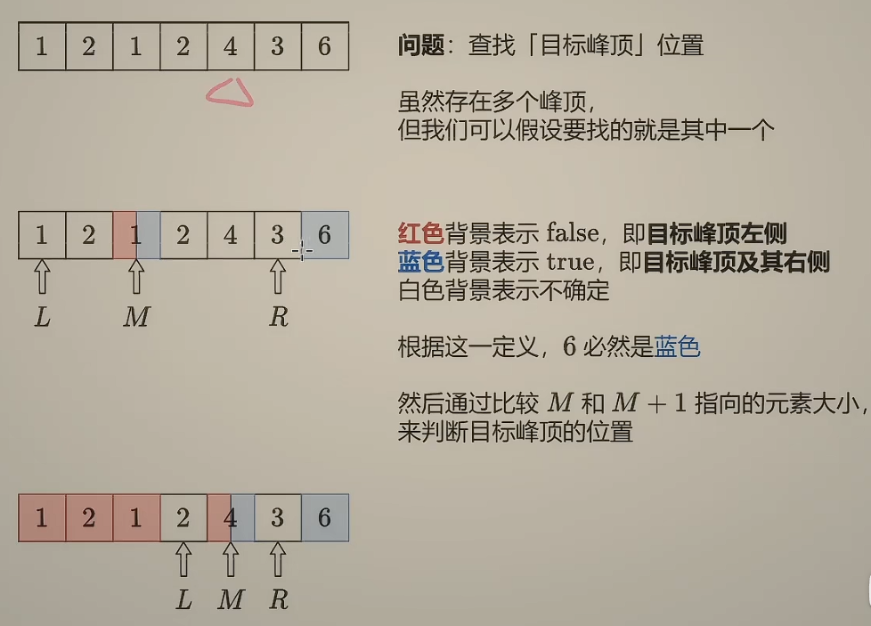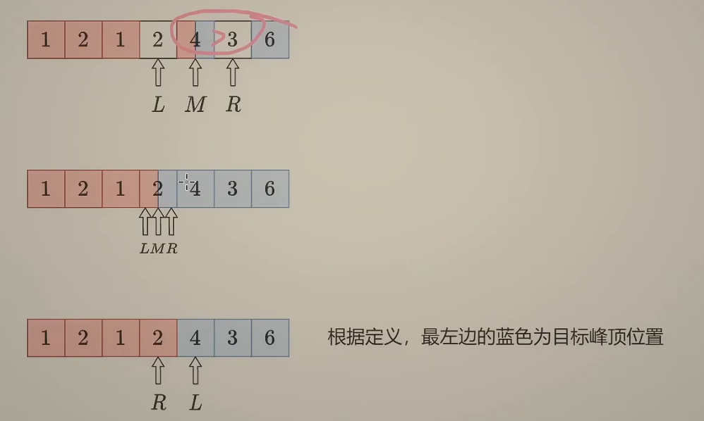由于相邻的值严格不等,所以根据mid和mid+1的数值比较,就能知道当前的mid是在峰值左端还是右端,如果mid小于mid+1,那么mid在峰顶左端;如果mid大于mid+1,那么mid就是峰顶,或者在峰顶右端。