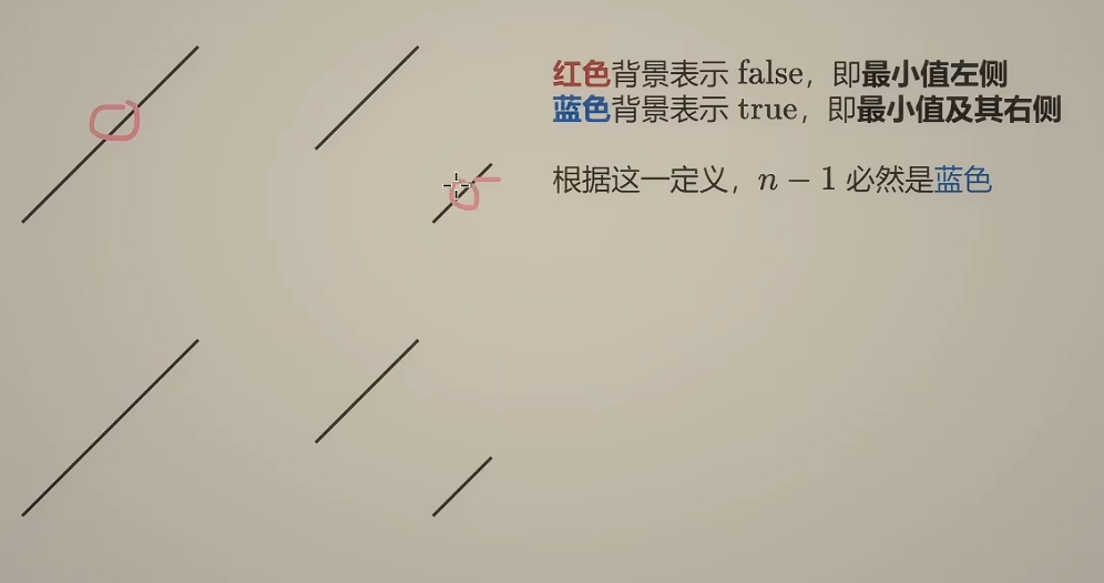 同样是寻找划分二分的条件,这里考虑用数组最后的值,由于最小值一定在数组中,所以最后的数组值要么是最小值,要么在最小值右侧,所以这题也可以在0到n-2之间二分。