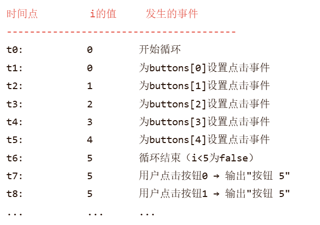 console.log('按钮 ' + i + ' 被点击'); // 总是"按钮 5 被点击"